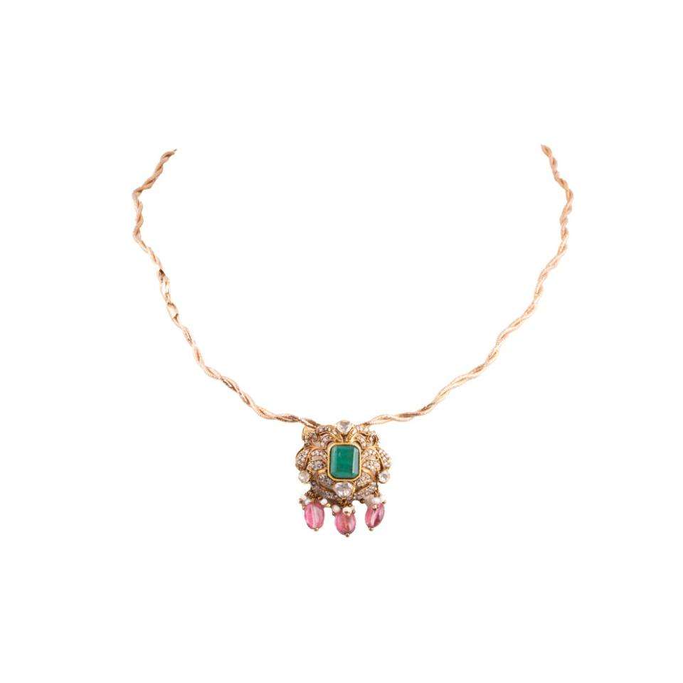 Ethnic Pure Gajaah 925 Sterling Silver Emerald Pendant Pure Silver Green Stone & Crystal Halo Pendant Pink Pearls Necklace Set