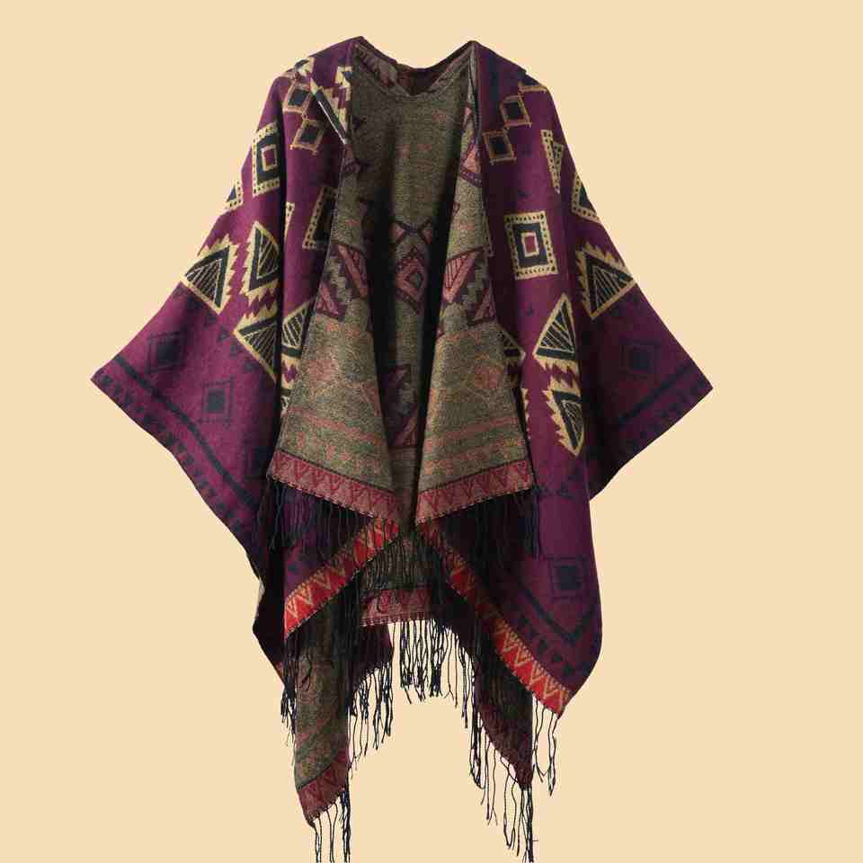 Ethnic Style Hooded Women's Travel Split Photo Shawl Tassel Geometric Argyle Warm Outdoor Large Reversible Breathable Cloak