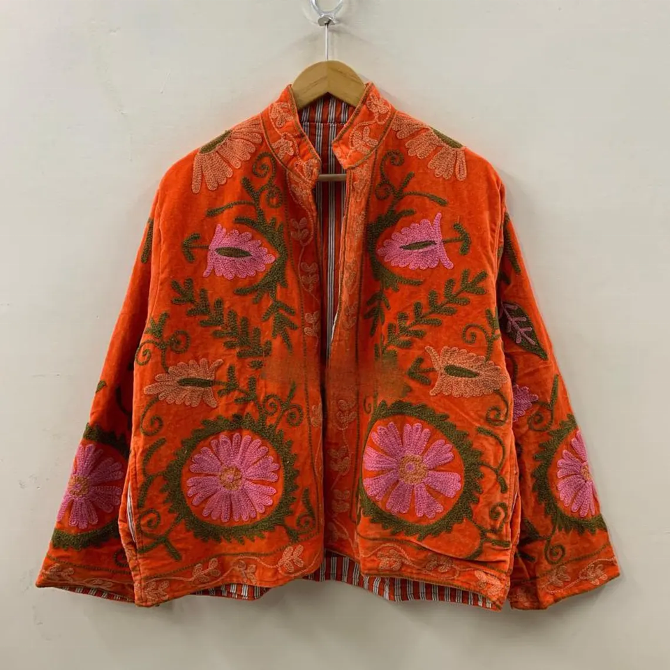 Ethnic Style Winter Jacket Velvet Suzani Embroidered Floral Pattern Short Festival Coat Uzbek Duster Outerwear