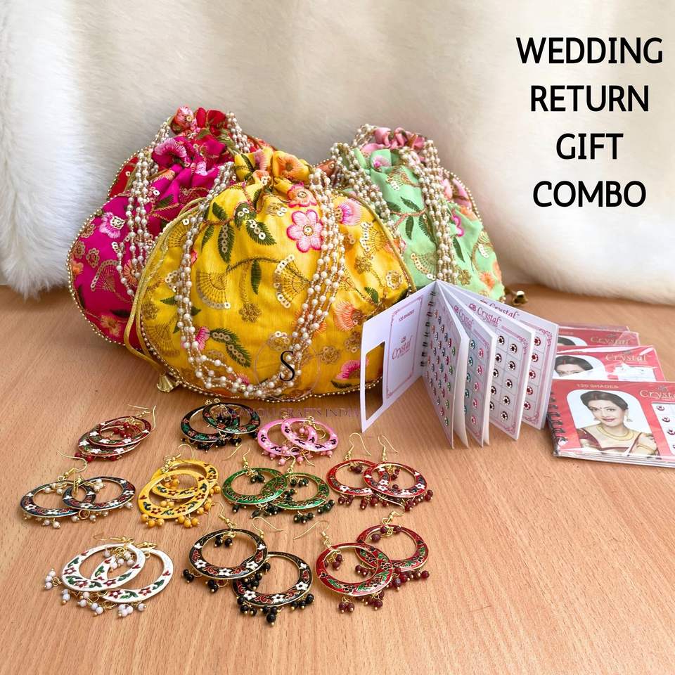Ethnic Wedding Favor Combo of Embroidery Work Potli Bags With Meenakari Chand Balis and Bindi for Return Gifts
