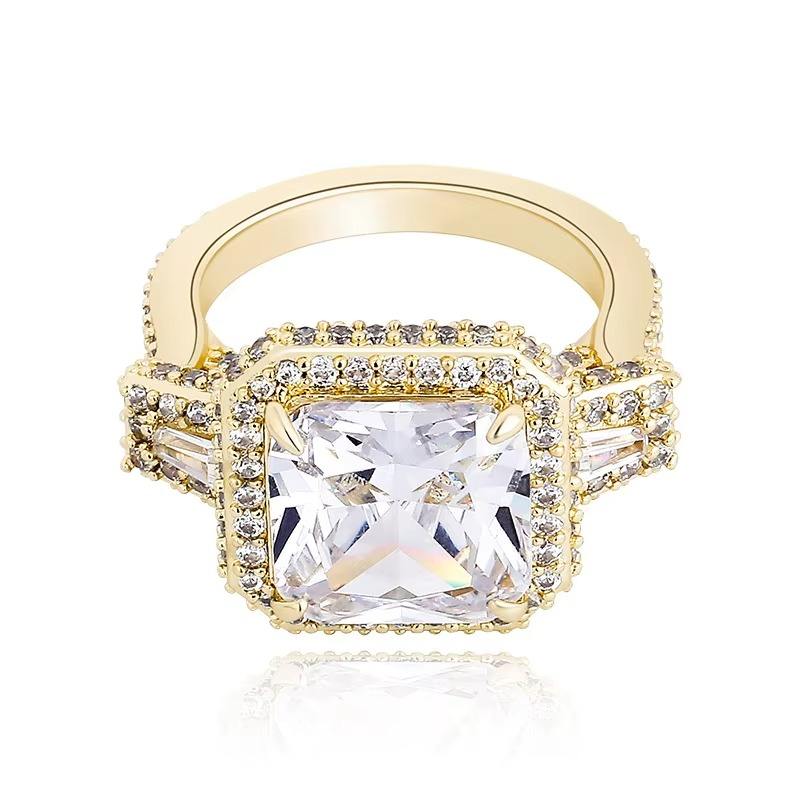 Europe United States Large Square Gemstone Ring Gold Plating Hip-Hop Men's Women's Diamond Bling Main Stone Zircon Made Brass