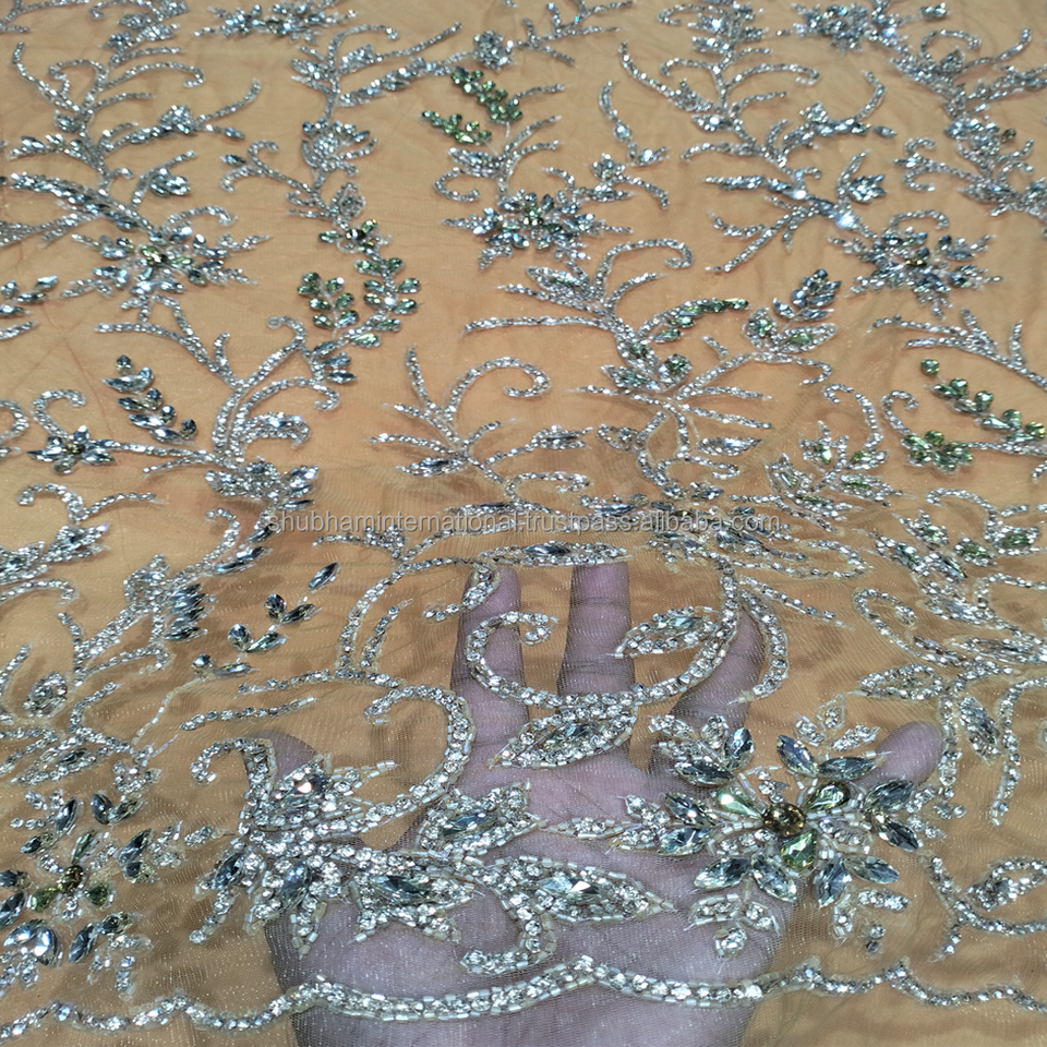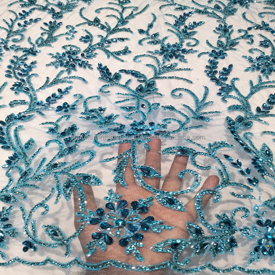 European American Luxury Floral Pattern Handmade Gold Stone Embroidery Beaded Lace Fabric 100% Polyester Breathable Lightweight