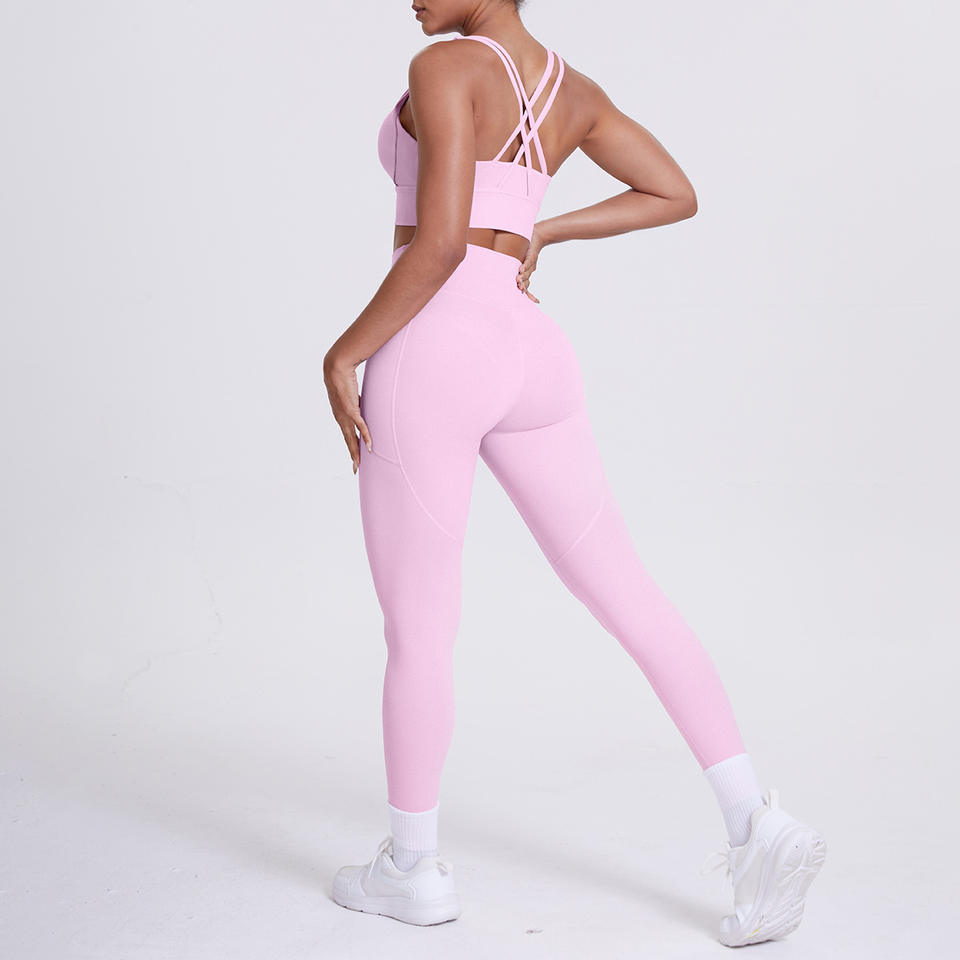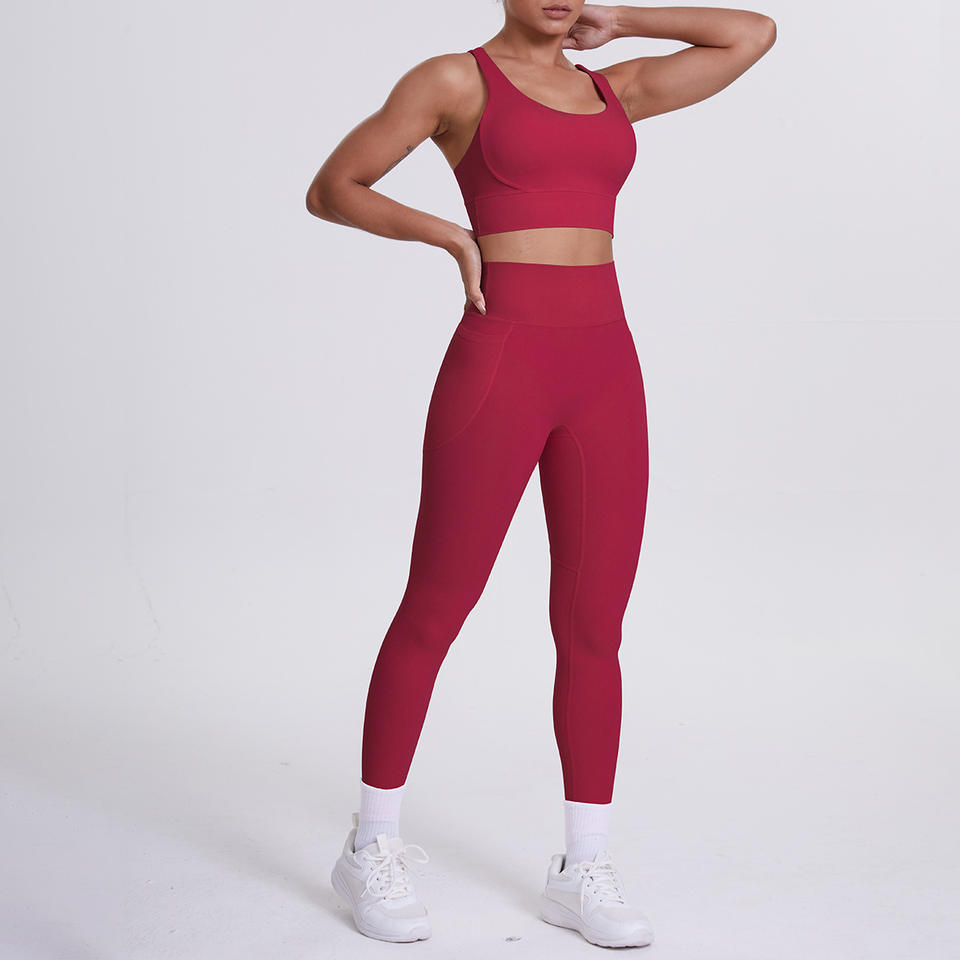 European American Naked Sanding Cross-back Bra Breathable Solid Sports Hip Pocket Trousers Fitness Yoga Clothing Two-piece Set