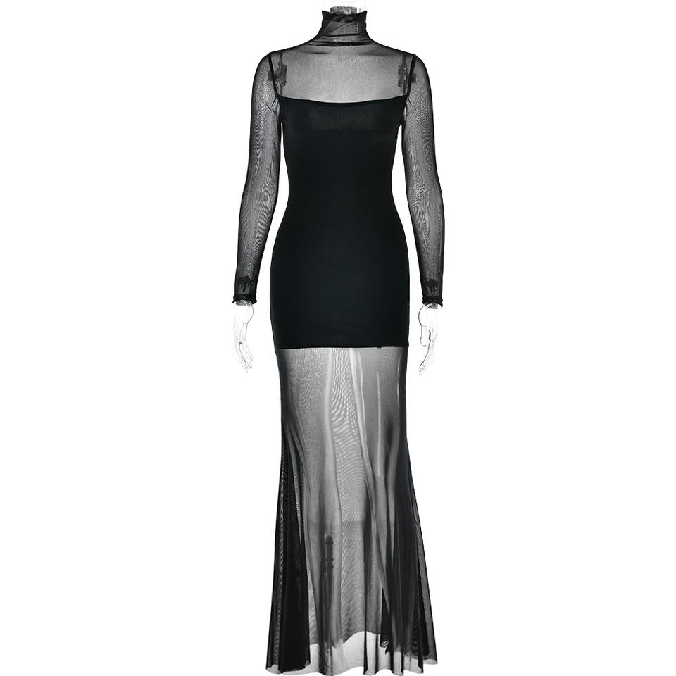 European American Style 2025 Spring Mesh Patchwork Long Dress Women High Neck Full Sleeve Translucent Evening Dress