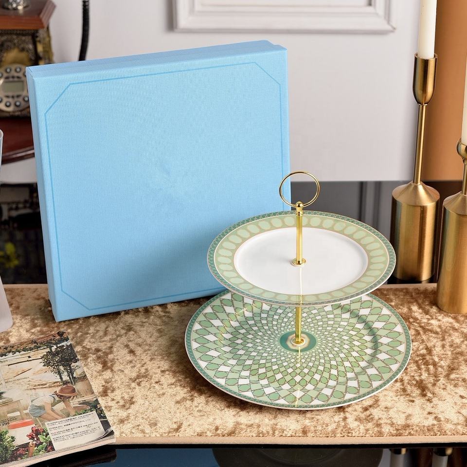European Luxury Green 2-Layer Bone China Round Under Glazed Cake Tray for Home Office Wedding