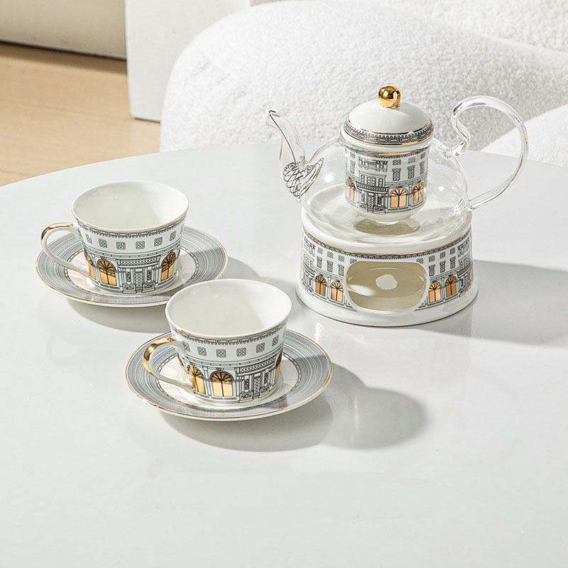 European Luxury High-End Porcelain Coffee Cup Set Gold French Tracing Elegant Construction Microwave Safe Includes Spoon Lid for