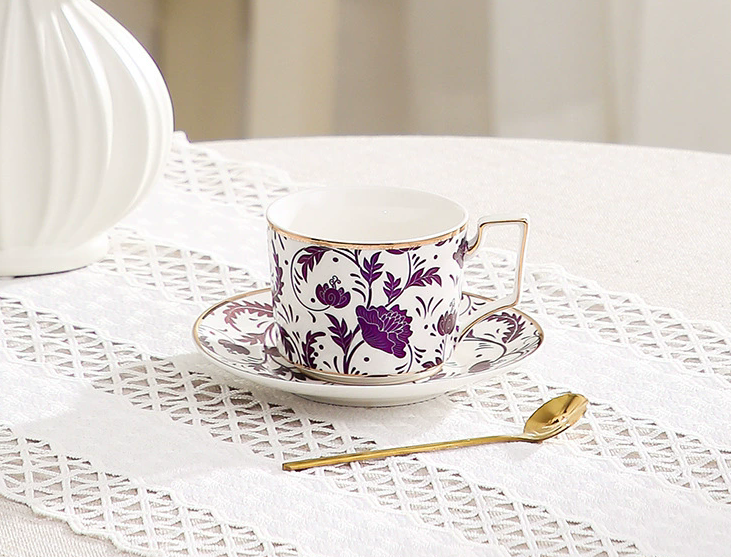 European Purple Flower Pattern Ceramic Tea Cup and Plate Set Modern Design Porcelain Drinkware for Gifts