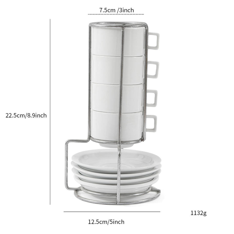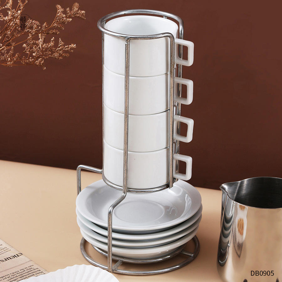 European Style Ceramic Coffee Cup And Saucer Set With Iron Stand 4 Cups 4 Saucers White Solid Color Afternoon Tea Use