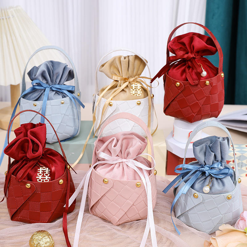 European Style Light Luxury Grid Pattern Rhomboid Leather Bucket Wedding Candy Gift Bag with Velvet Lining