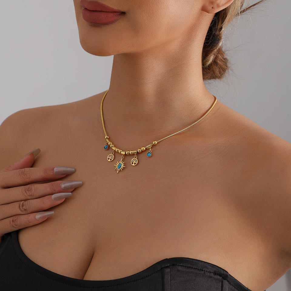 European and American Cross-Border Jewelry Bohemian Retro Style Short Necklace Turquoise Inlaid Star Hollow Life Tree Pendant