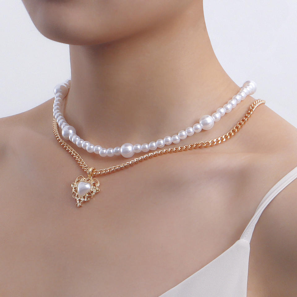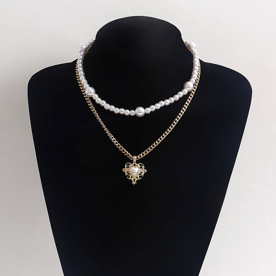 European and American Cross-Border Jewelry Trendy Double-Layer Imitation Pearl Heart Pendant for Women Hot Girl Versatile Beaded