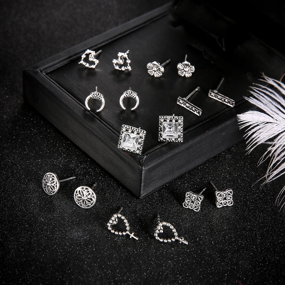 European and American cross-border accessories retro antique silver heart cross ivory flower 8 pairs set earrings wholesale