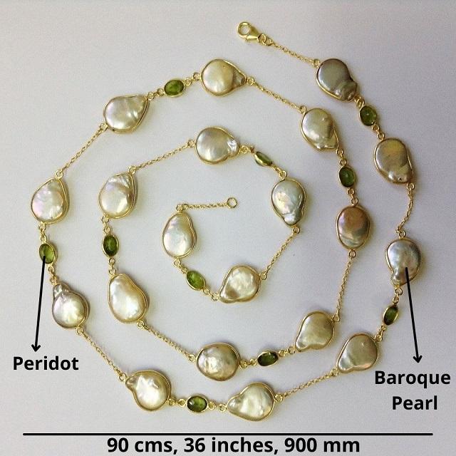 Everyday Wear 925 Sterling Silver Gold Plated Peridot and Baroque Pearl 90 Cms. Long Chain Necklace