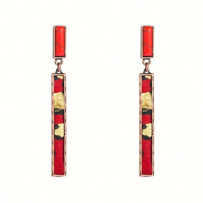 Exaggerated and Personalized Long Alloy Inlaid Turquoise Red Coffee Color Leopard Leather Temperament Party Earrings