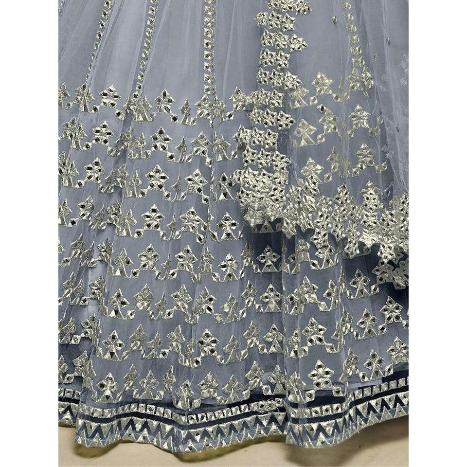Excellent Grey Foil Work Net Wedding Wear Lehenga Choli With Dupatta