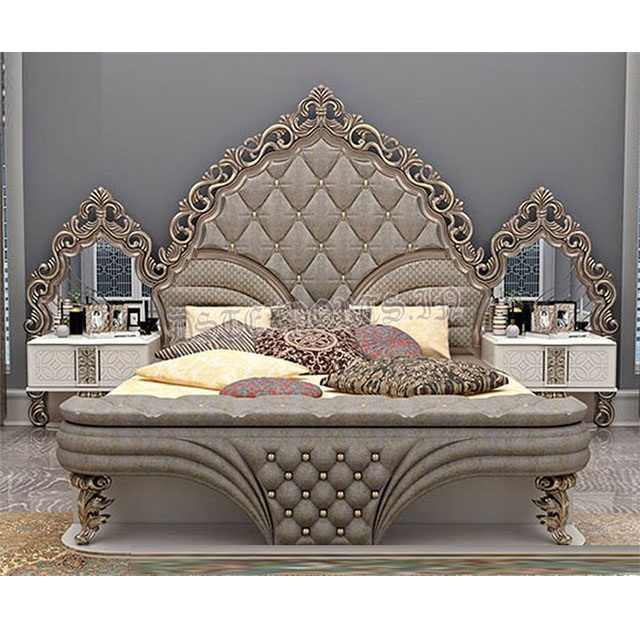 Excellent Quality Baroque Style Queen Size Bed Modern Wood Carving Bed With Side Stools High Back Hand Carved Maharaja Bed