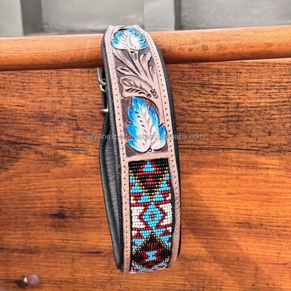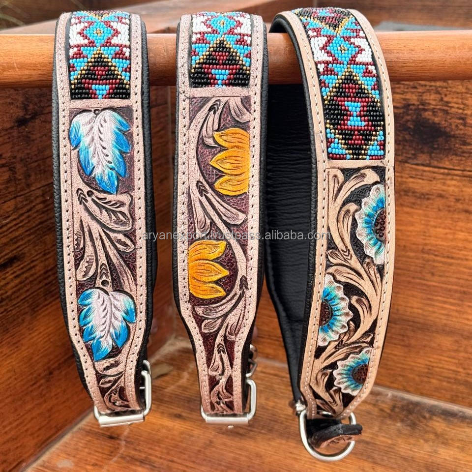 Exclusive 100% Genuine Leather Soft Padded Dog Collar With Hand Carving Top Indian Supplier Wholesale Manufacturer