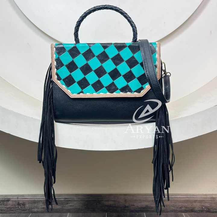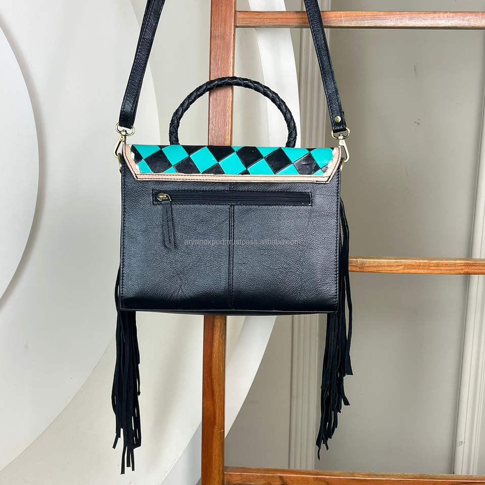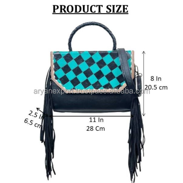 Exclusive Checkered Board Design Genuine Tooled Cowhide Leather Crossbody Handbag for Women Featuring Western Style Fringe Bag