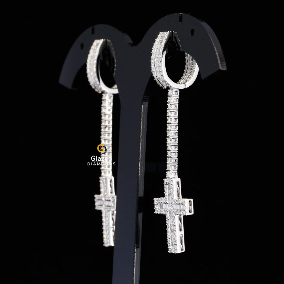 Exclusive 10kt White Gold Hoop Earrings with Cross Design Round Baguette Cut VVs Clarity Moissanite Diamonds for Weddings