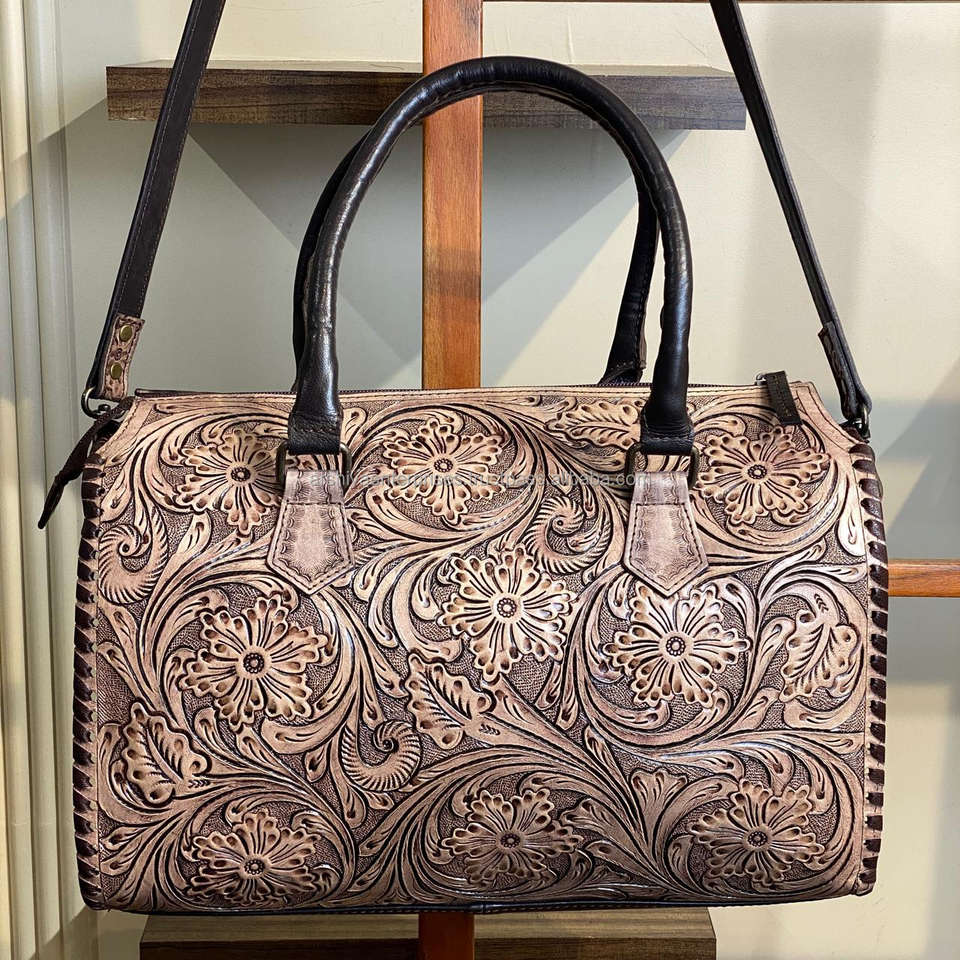 Exclusive Customizable Hand Tooled Genuine Leather Travel Duffle Bag with Intricate Floral & Card Design for Outdoor Use