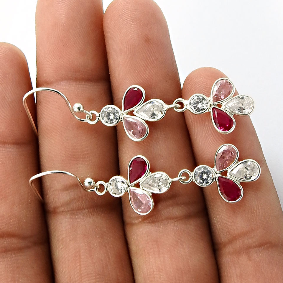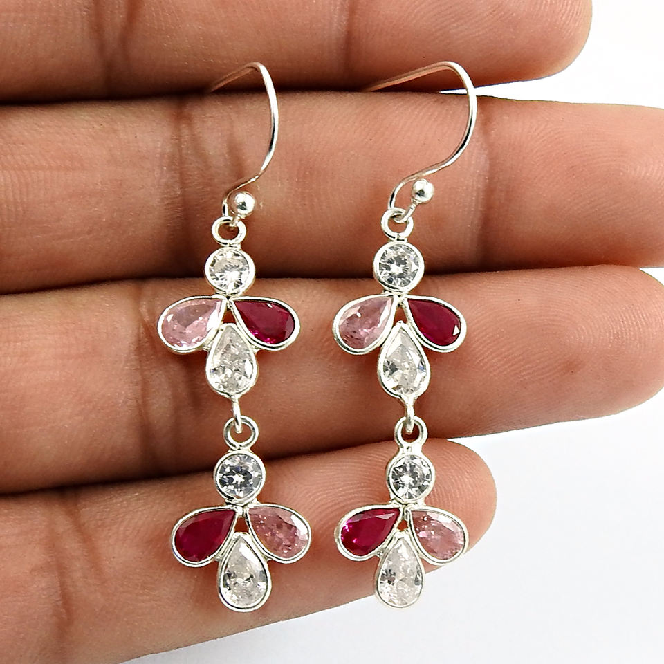 Exclusive Design 925 Sterling Silver Ruby Pink White Cubic Zirconia Pear Shape Dangle Earrings for Woman Girls Handmade Jewelry