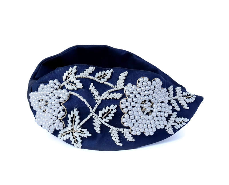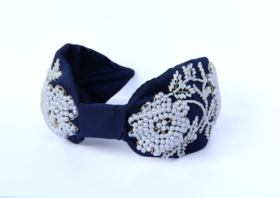 Exclusive Design Trendy Turban Style Blue and White Beaded Best Fashion Hair Accessories Handmade Fabric Women and Hairbands