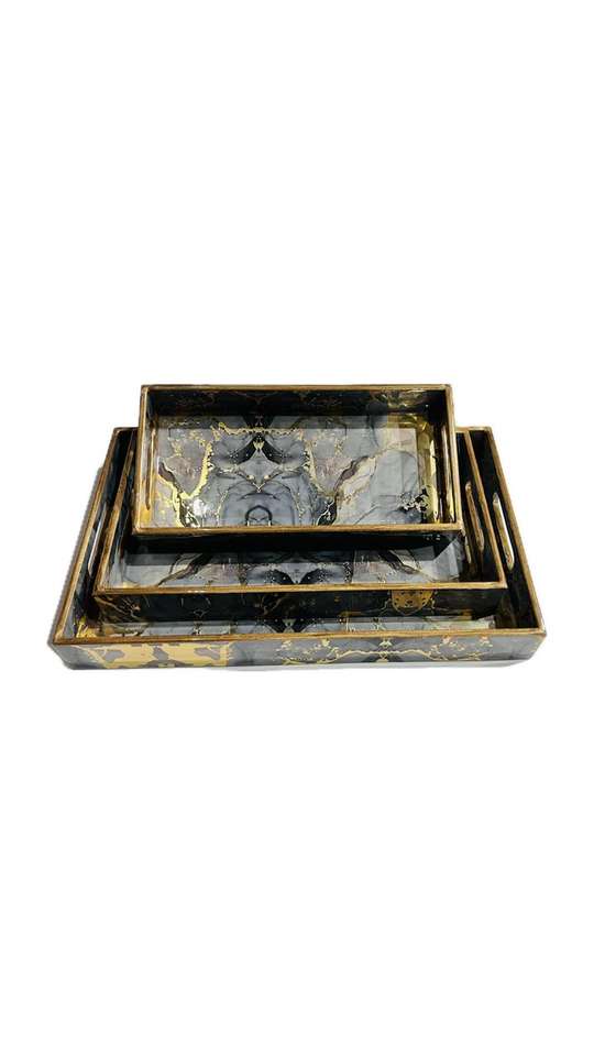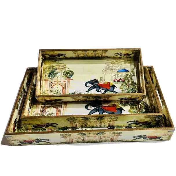 Handmade Plant Pattern Floral Printed Red & White Wooden Serving Tray Exclusive Art Deco Design with Black Border Eco-friendly