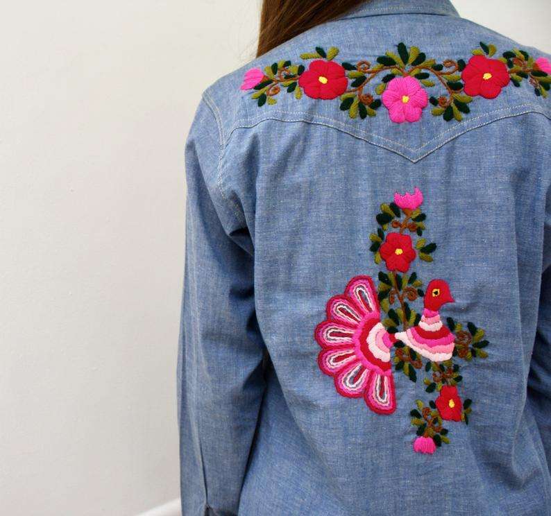 Exclusive Elegant Peacock Embroidered Vintage 70's Denim Shirt Blouse 100% Cotton Hippie Lady Blue Mexican Bird Collar Shirt Top