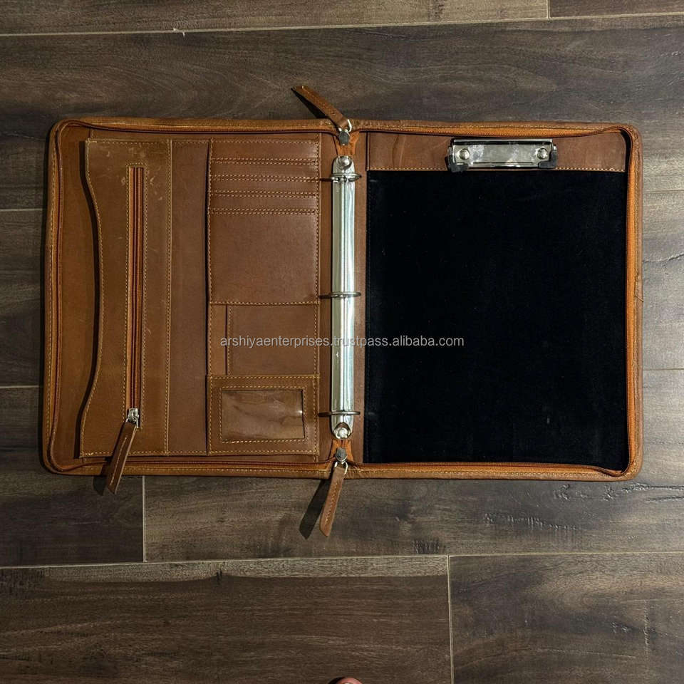 Exclusive Genuine Tooled Leather Zipper Folder Cowhide Portfolio Time Table Notebook Multi feature A4 Size Paper With Card Slot