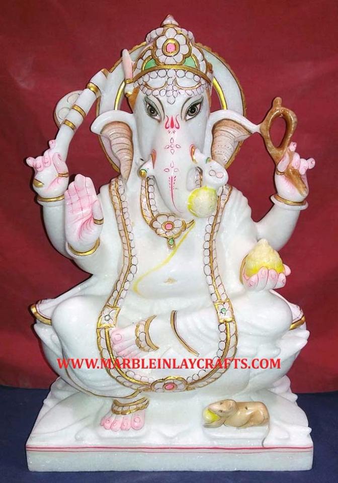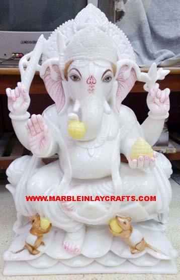 Exclusive Makrana Marble Handmade Colorful Ganesha Statue With Blessing Hand In Sitting Position For Home And Temple Decoration