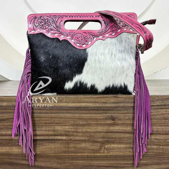 Hand Tooled Cowhide Leather Fringe Handled Crossbody Bag