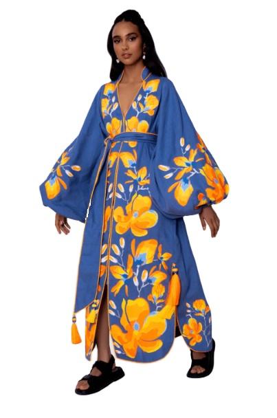 Exclusive Ukrainian Embroidered Full Balloon Sleeves Ukraine Women High Neck Belted Dresses