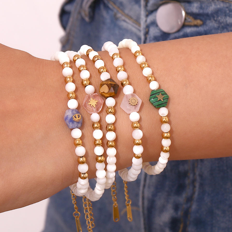 Exclusive Women's Stainless Steel 18K Gold-Plated Hexagonal Natural Stone Bead Bracelet Trendy Stackable Boho Chic Jewelry