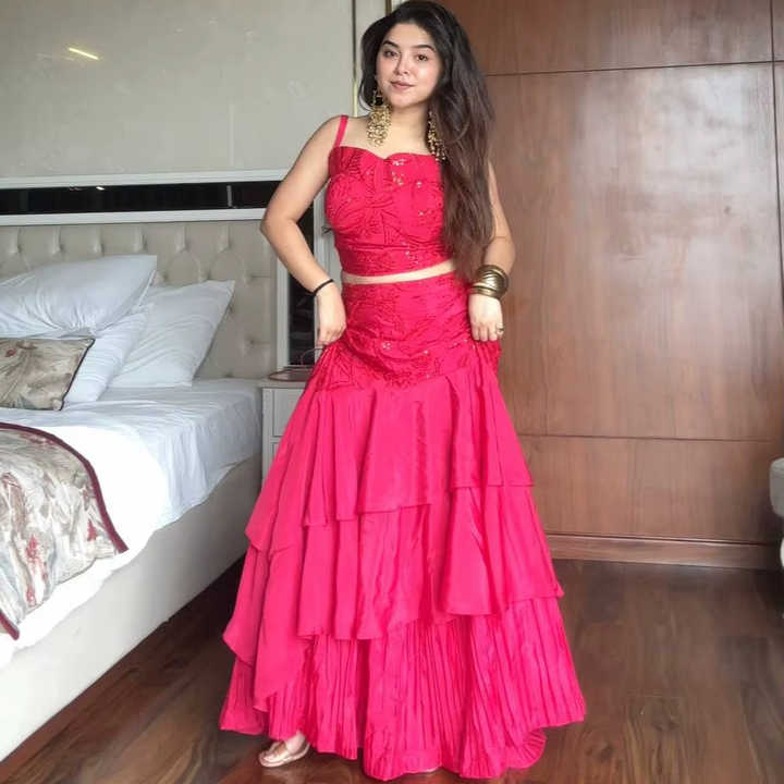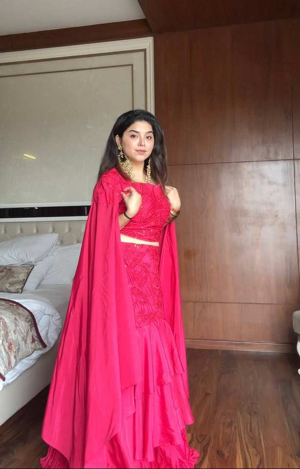 Exclusive french crape designer lehenga set with sweetheart embroidered blouse layered floral ruffle skirt and cape dupatta