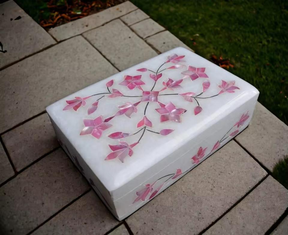 Export Quality Handmade Marble Jewellery Box with Pink Mother of Pearl Work for Sale from Indian Exporter