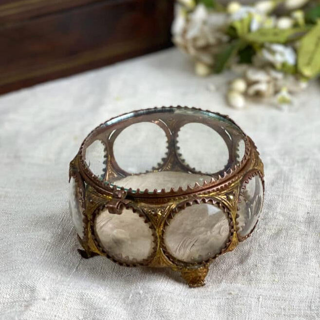 Export Quality Wholesale Price Bulk Making Brass Frame Antique Finished Round Beveled Glass Storage Box For Jewelry Keepsake Box