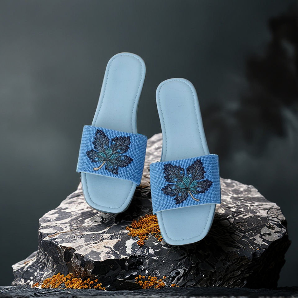 Export Quality Women Slide Sandals Lavender Floral Flat Slippers Summer Boutique Casual Footwear Handmade Embroidered