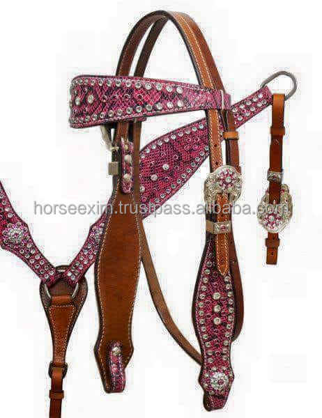 Exporter of High Quality Hand Tooled Painted and Brass Rivet Decorated Leather Western Horse Headstall for Horse