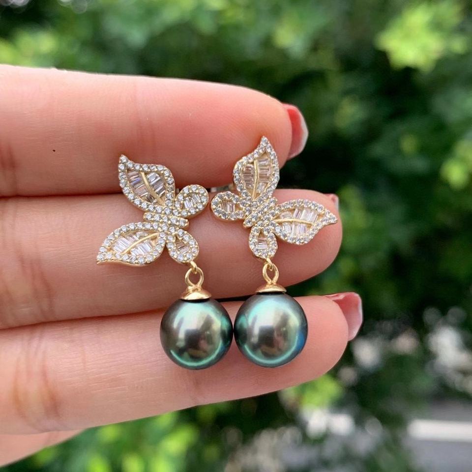 Exquisite 925 Sterling Silver Dangle Earrings Princess Natural Pearl Three Leaf Flower Inlay 11-12MM Flawless Front S925 Inlay