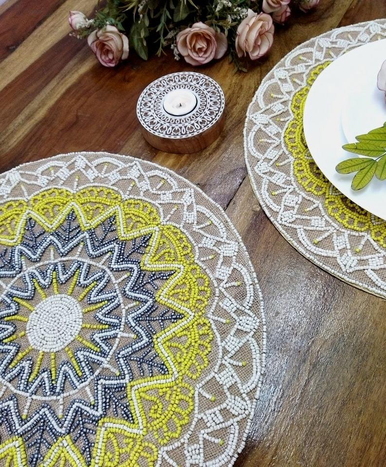 Exquisite Beaded Placemat Table Top Dinnerware Dining Decorative Table Placemat Round Embroidered Floral Theme Placemat