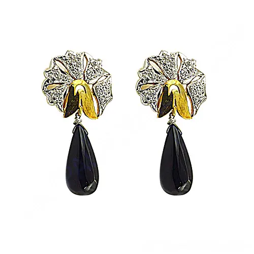 "Exquisite Diamond Floral Drop Earrings with Black Onyx and Gold Plating"