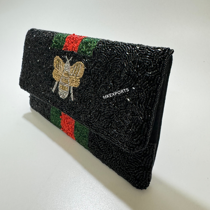 Exquisite Handcrafted Black & Gold Beaded Clutch with Delicate Bee Motif Elegant Artisan-Made Evening Bag for Special Occasions