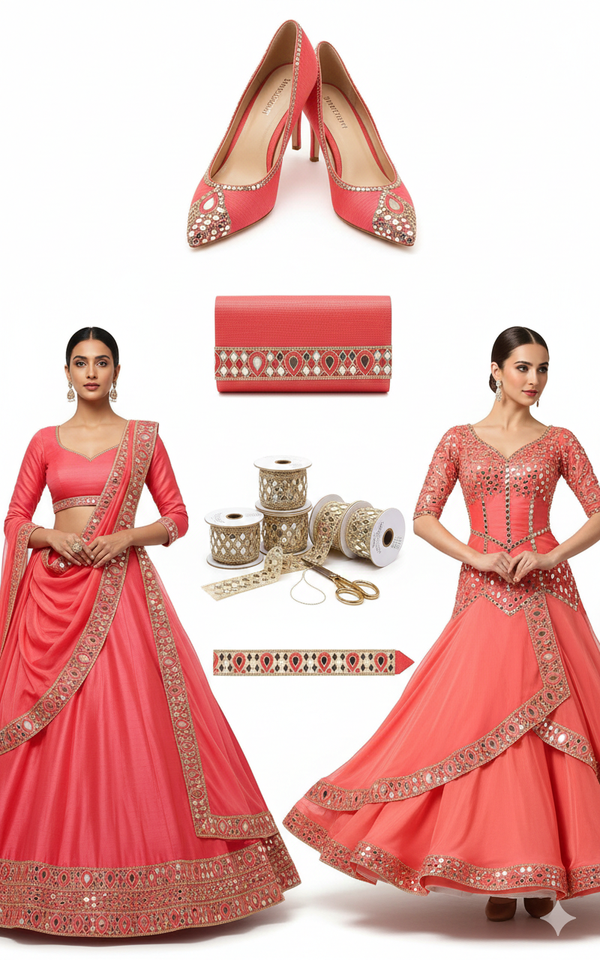 Exquisite Handcrafted Traditional Indian Shisha Mirror Zari Embroidery Organza Lace Trims Dual Pack for Ethnic Bridal Garments