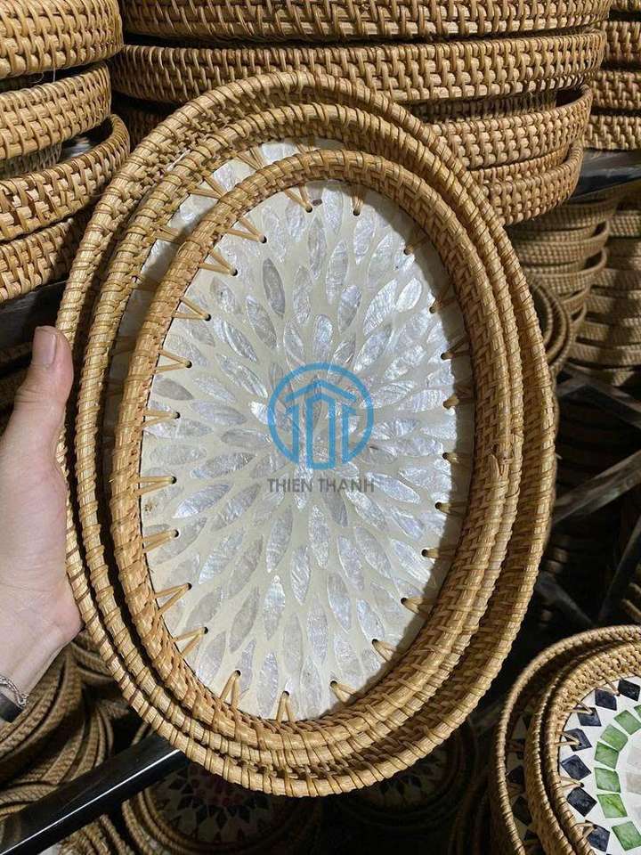 Exquisite Handmade Rattan Serving Tray with Iridescent Mother of Pearl Floral Inlay Refined Natural Woven Frame Sophisticated