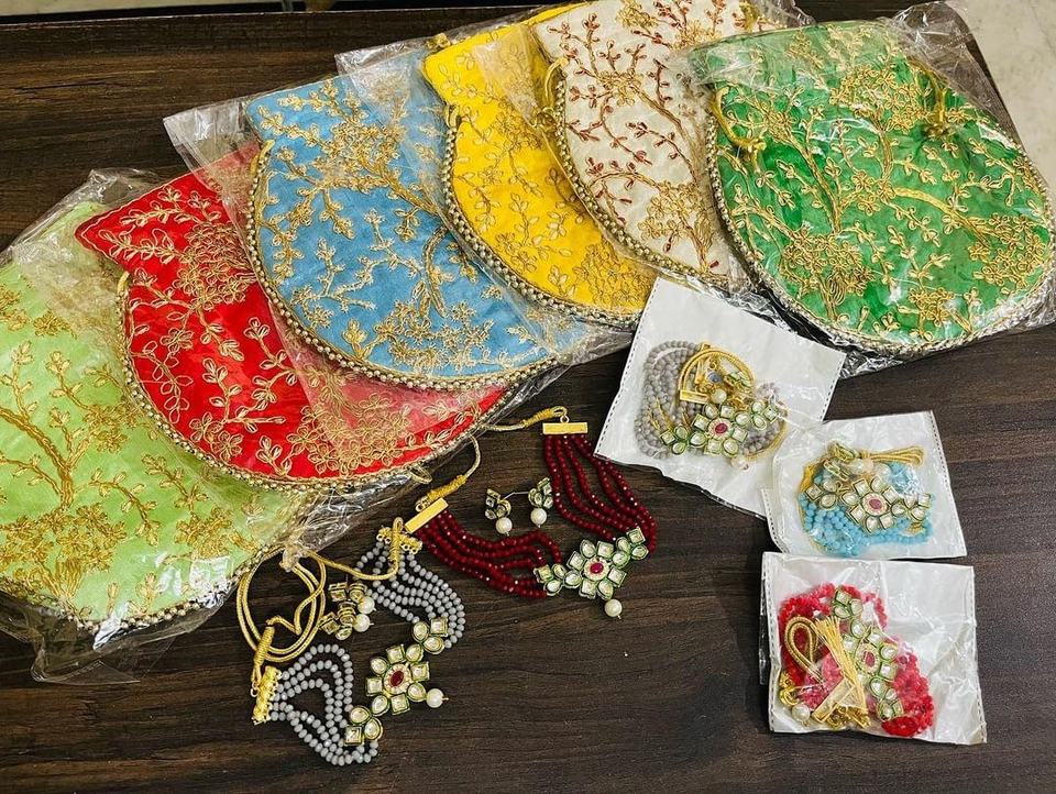 Exquisite Kundan Jewellery Combo Set with Richly Embroidered Silk Potli Bags Intricate Golden Floral Motifs-Gift Set