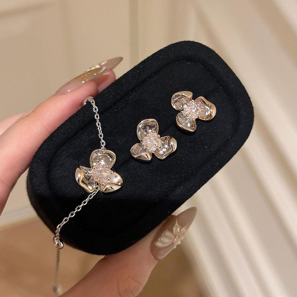 Exquisite S925 Pure Silver Powder Diamond Bell Orchid Brocade Flower Shaped Earring and Bracelet Set for Women Fashion Jewelry