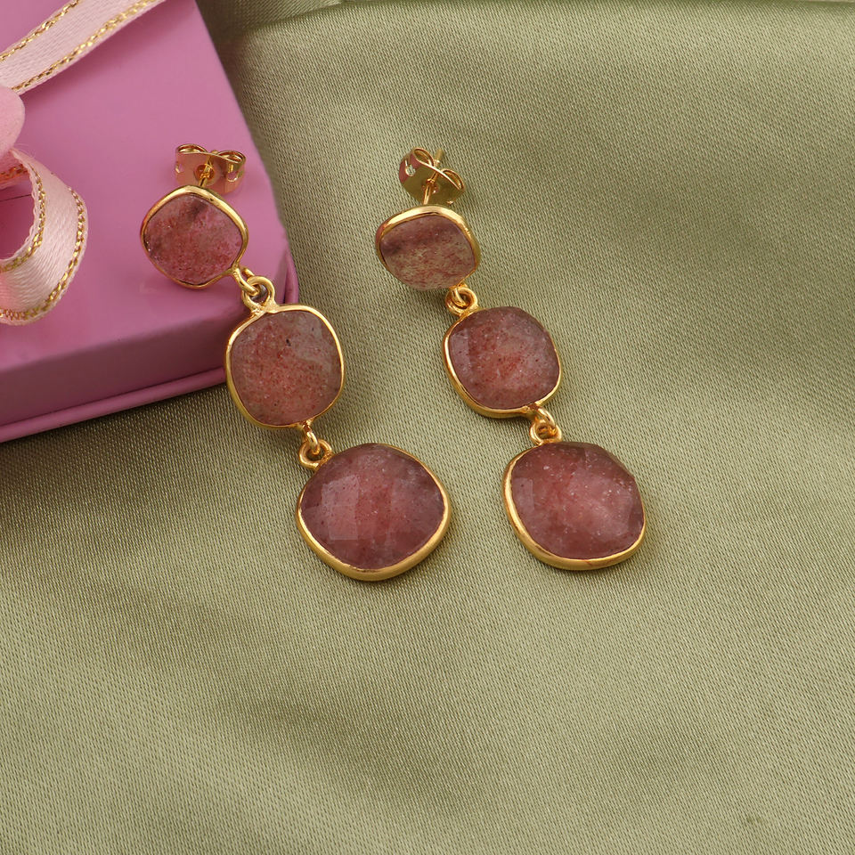 Exquisite genuine cherry quartz drop earrings cushion shaped smooth gemstone three tier gold plated accessories for women girls