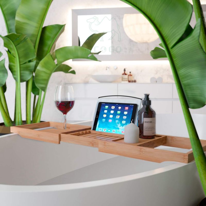 Extendable Bath Caddy Bathtub Tray with Reading Rack Wine Glass Holder