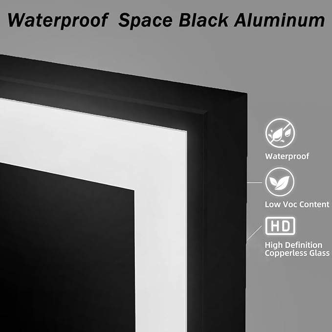 Extra Large Rectangle Modern LED Black Bathroom Vanity Illuminated Shatterproof Frame Tricolor Lighted Backlight Wall Mounted