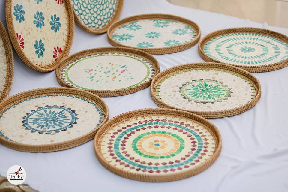 Eye catching rattan mother of pearl tray Vietnam origin for retailing or online gift boutiques unique handmade home accessories